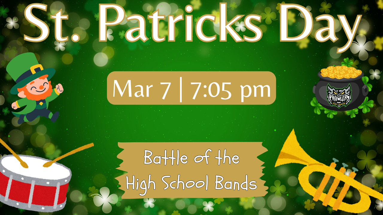May the luck o' the Irish be with you as we celebrate St. Patrick's Day with specialty themed jerseys and Irish food and drinks! Throughout the night, local high school bands will get the spotlight. Fan will get to vote for their favorite band performance and the winning school gets a prize to support its music program!